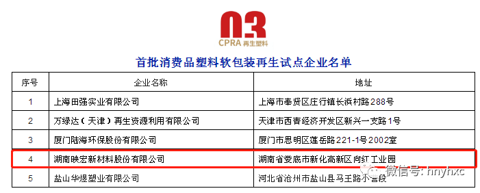 入围名单有宝洁中国、立白集团、京东物流和百事可乐等企业,其中湖南映宏新材料股份有限公司入围首批消费品塑料软包装再生试点企业名单。